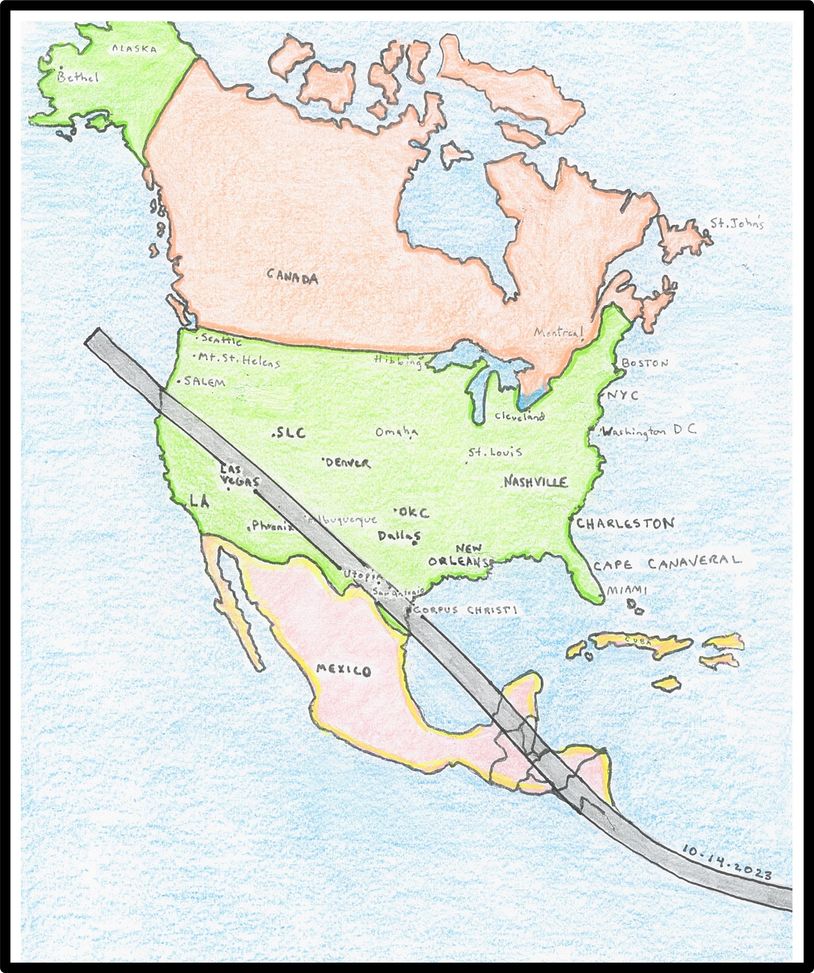 A "Ring of Fire"/ Sunflower annular eclipse passes over the western US on 10-14-23 before traveling to the Yucatan and crossing northern Brazil. 177 days before the spring total eclipse.
