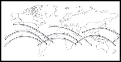 There are 40 to 41 different Saros Cycle Eclipses returning at any given moment in history. Each is different. Above, the various eclipses of a single Saros member)painted one at a time every 18 years on the face of earth. The individual eclipse keeps returning to different locations in that timely fashion for more than a thousand years. It begins its eclipse life as a partial eclipse, gradually becomes a Ring of fire eclipse, turns into a a hybrid, and eventually matures into a series of total solar eclipses. Finally it fades in the same fashion until the cycle eventually dies. It mimics life and follows the idea of maximum Expression. Due to the elliptical nature of the orbits of Earth and the Moon, the exact duration and number of eclipses in a complete Saros is not constant. A series may last 1226 to 1550 years and is comprised of 69 to 87 eclipses, of which about 40 to 60 are central (i.e., total, hybrid or annular)