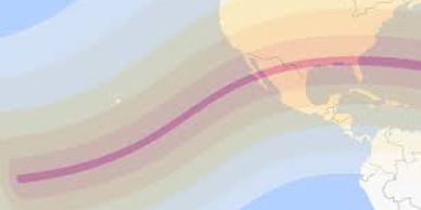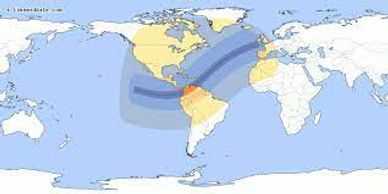 An eclipse beginning in the Pacific cuts across extreme northern South America (totality in Medillin). Narrow path of totality covers tiny volcanic island of Montserrat 79 years before its eruption, crosses Atlantic to stop just shy of Britain. Saros cycle 139.