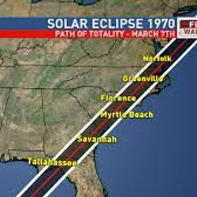 Total Eclipse. the southeastern seaboard had mostly cloudy weather though Florida remained fair. 93% totality at Cape Canaveral 230 days after men landed on the moon. Totality at Charleston South Carolina, the greatest Slave Port in North America..95 % totality in Washington D.C., 96% in New York and 97% in Boston. The end of the sixties, eclipse wise. The Beatles announced their break-up a month later. 3 months and a day after Altamont Rolling Stone Concert