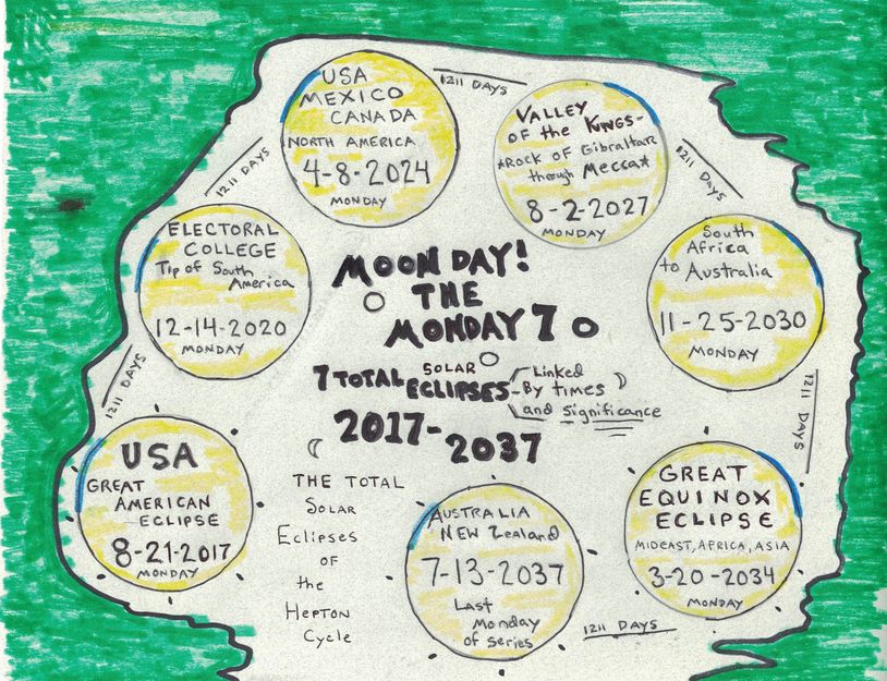 Once again, a hand-drawn graph. This time, depicting the 7 eclipses of the Monday Hepton Cycle which began with the USA Judgment eclipse of 8-21-2017 and concludes almost 20 years later in Australia and New Zealand on 7-13-2037. Aside from the electoral college eclipse, all the other eclipses in this Hepton physically cross each others shadow paths in alternating sequence. In other words, the first and 3rd eclipses cross each other with a spectacular symmetrical x in the USA. The fourth and sixth eclipses similarly cross each other East of the Valley of the Kings just off the coast of Egypt in the Red Sea. The 5th and 7th eclipses cross each other( though just barely) west of Brisbane, Australia. I can find no scientific reason for this particular crossing feature of the current Hepton Cycle, though there is definitely one repeating cross that has defined itself previouosly ( Sraos 136 and 145) we may discuss later.