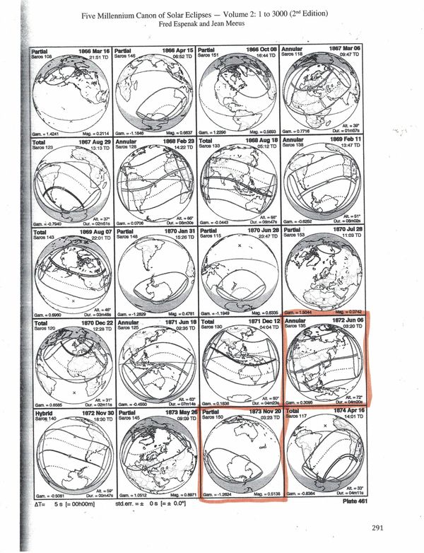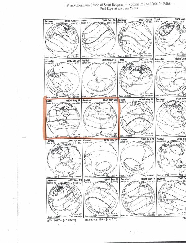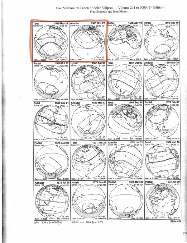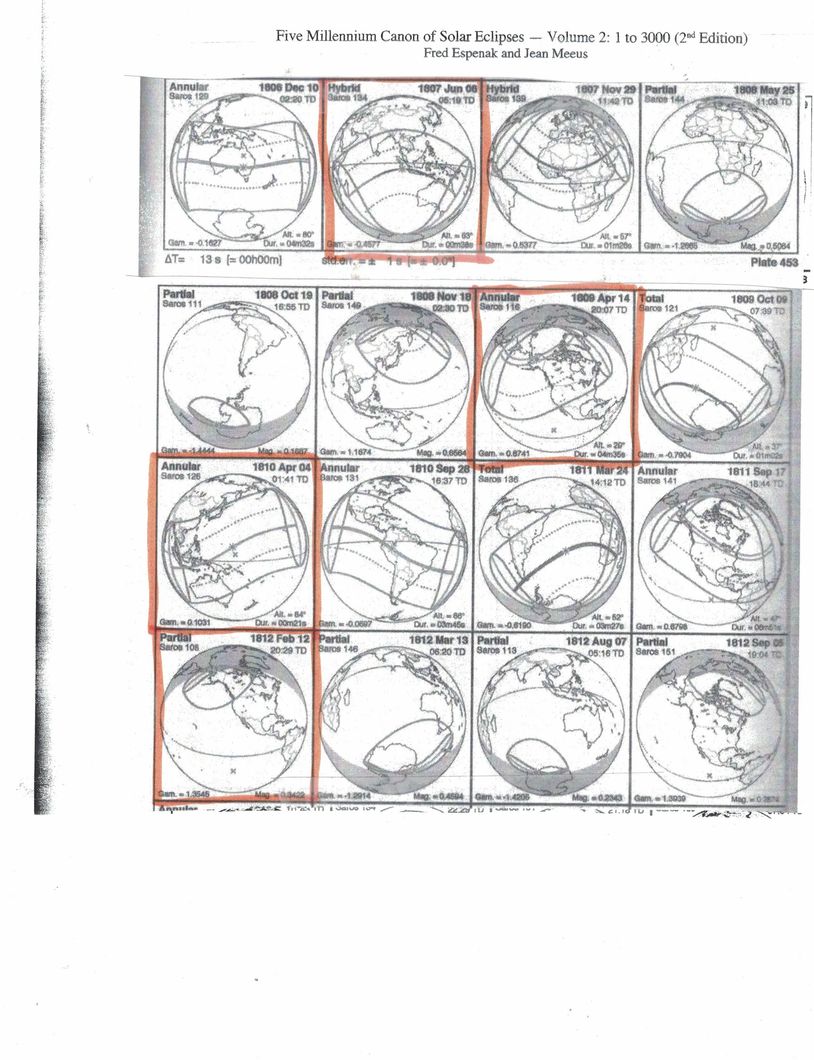 you will also see on this chart the Oct.19th Metonic (here in 1808), which is on the anniversary of the victory of American forces over the British at Yorktown in 1781 ...this returns in the Oct 19, 1865 cross-country eclipse in the USA 188 days after Lincoln's murder. Notice the May 25th and Nov 18 eclipses on either side of the Oct.19th Yorktown Anniversary. These will become the Kennedy side by side eclipse Metonic in 92 years.