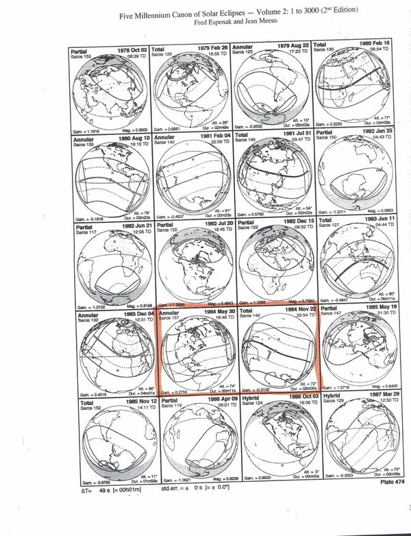 The Lincoln Eclipses were amazing because the birth and death day metonics are so close. But absolutely nothing compares to the Kennedy Metonic, where the birth and death eclipses sit side byy side, exactly one eclipse season apart ( 177 days). The very first eclipses of the 20th Century are on the Kennedy Metonic--May 28 1900 ( one day before birthday)and Nov 22 1900 (exact death day)... The Kennedy birthdates and death dates appear side by side in the year of his second birthday in 1919. These dates are 177 days apart, a perfect eclipse season span, and therefore recur essentaially in perpetuity. They will reappear in 1938 on JFK's 21st birthday, again as the first eclipses after his assasination ( 1965) and finally as a strange testament to reality in 1984.